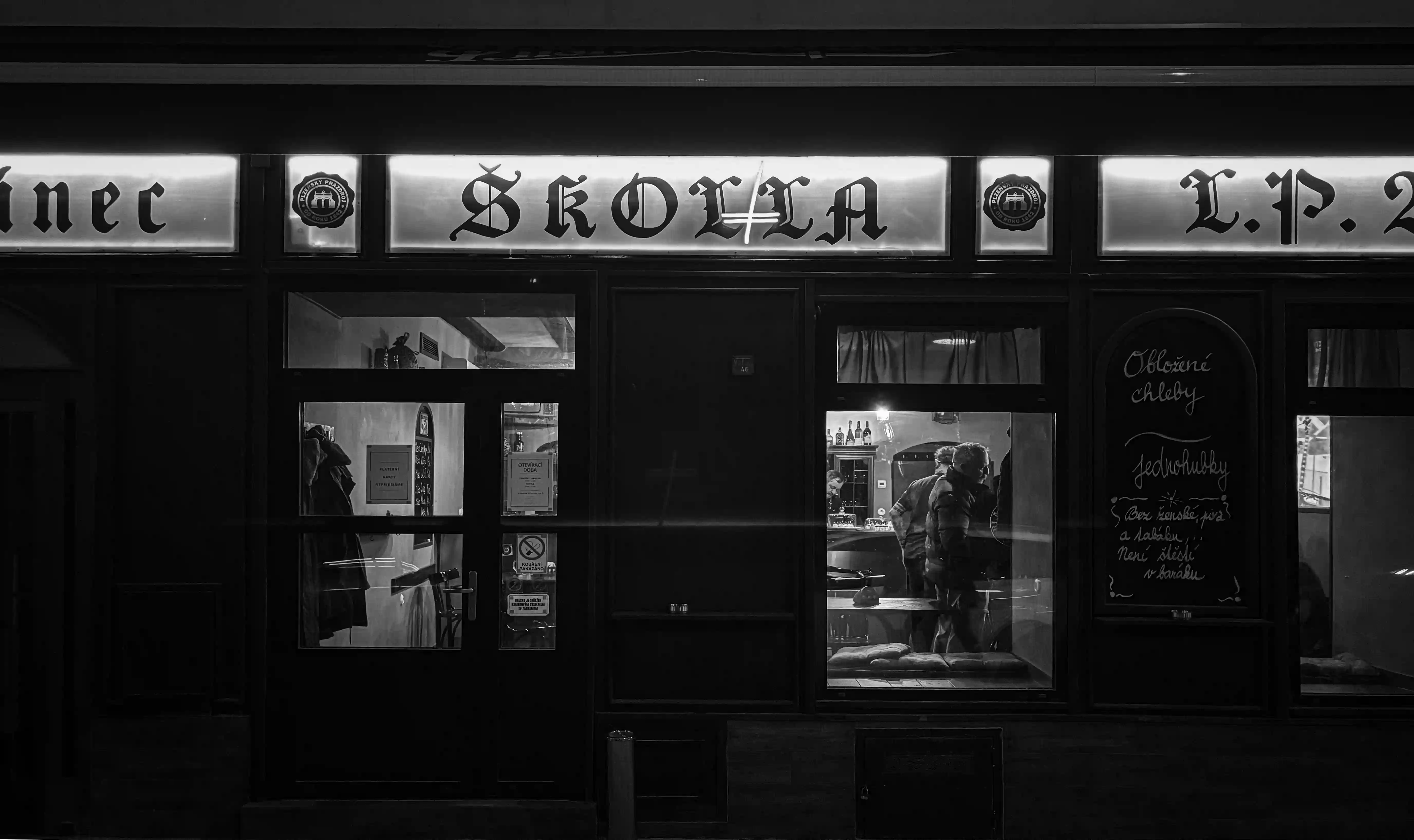Školla otevřela v roce 2025 jako místo, kde se potkává starý duch české pivnice s přístupem, který lidé od dobrého podniku dnes čekají. Tmavé dřevo, šalvějové stěny, dřevěné trámy a přátelský šenkýř za barem.